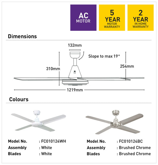 Link 48” AC Ceiling Fan with Tricolour LED Light & Wall Control-White